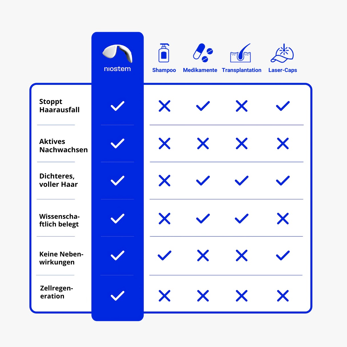 Diese Übersicht zeigt, wie sich niostem im Vergleich zu anderen Methoden der Haarregeneration abhebt – mit einem ganzheitlichen, wissenschaftlich fundierten Ansatz, der gezielt an der Zellregeneration ansetzt.