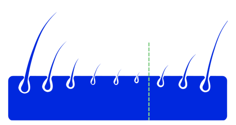 Der Schrumpfprozess schreitet stetig voran und wird mit der Zeit immer aggressiver, da immer mehr Haarfollikel deaktiviert werden. Dies führt dazu, dass mehr Haare aus der anagenen Wachstumsphase in die telogene Ruhephase übergehen.